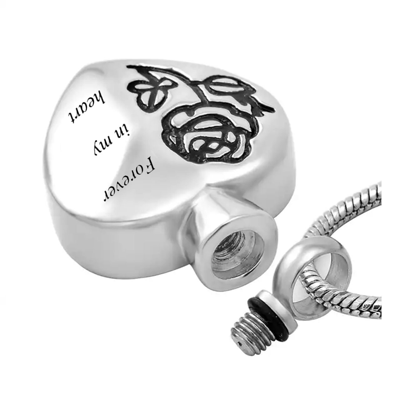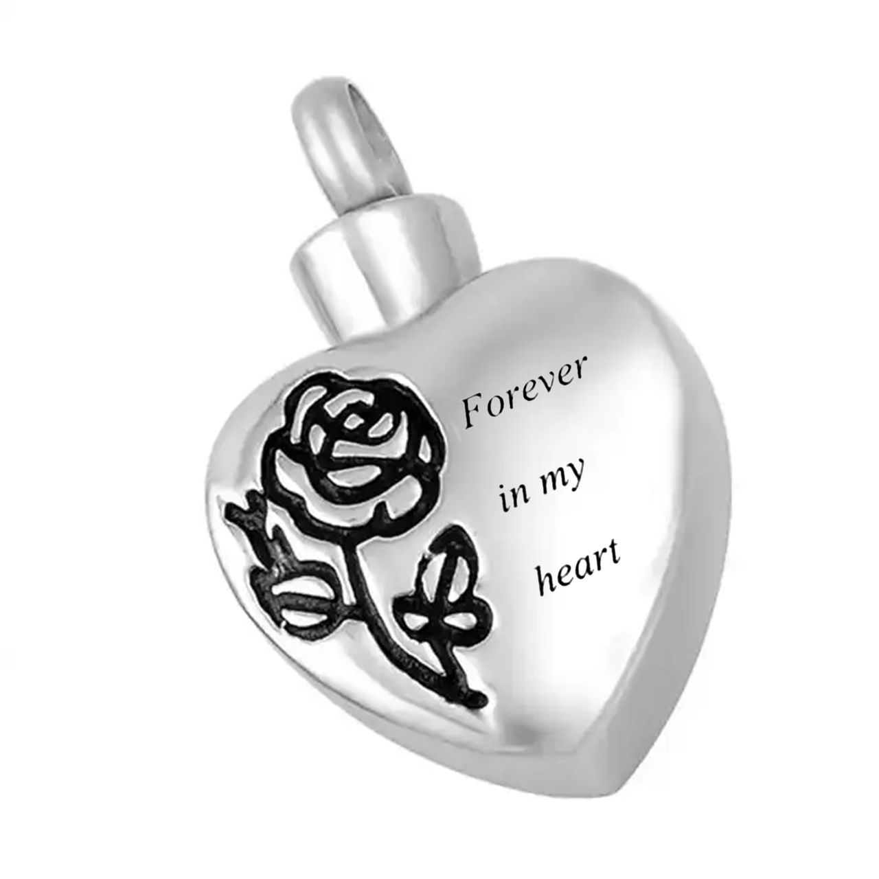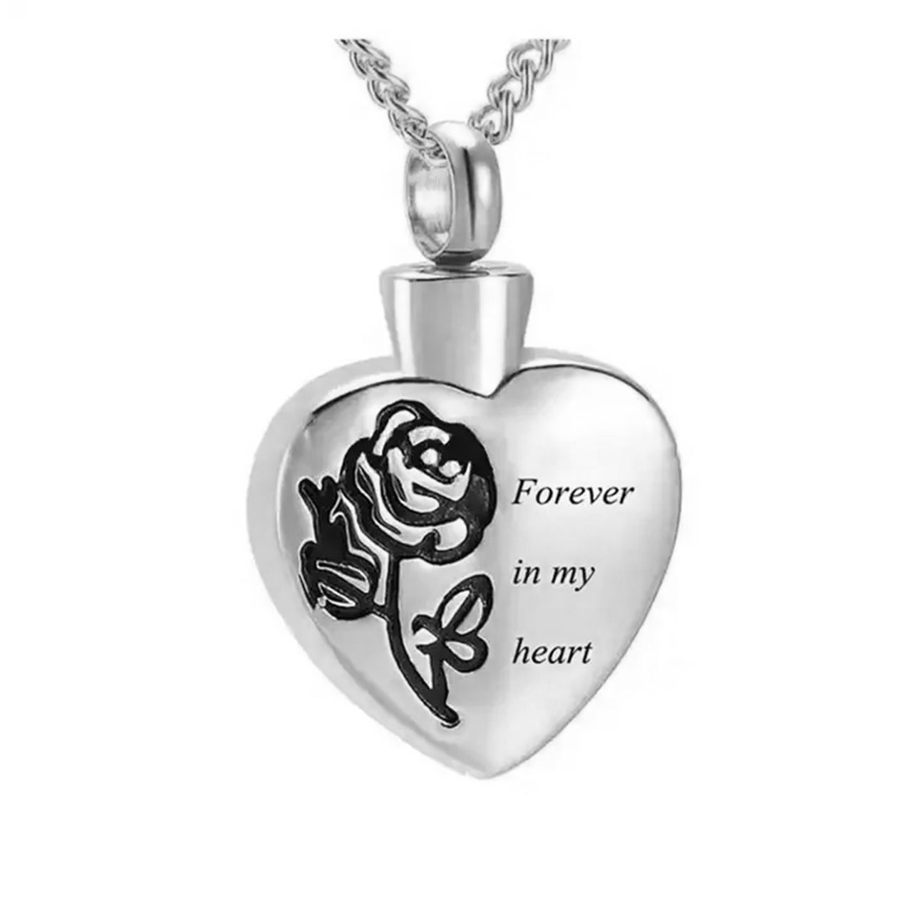 Het hart is hét symbool van liefde, verbondenheid en herinnering. Door de hartvorm wordt direct duidelijk dat dit sieraad een diepe emotionele betekenis heeft. De roos staat voor schoonheid, liefde en vergankelijkheid. Samen met de tekst Forever in my heart laat dit zien dat de herinnering aan uw dierbare altijd bij u blijft. Het is een symbool van troost dat u dagelijks kunt dragen.
