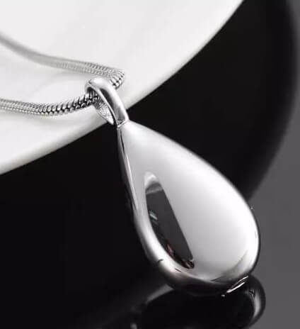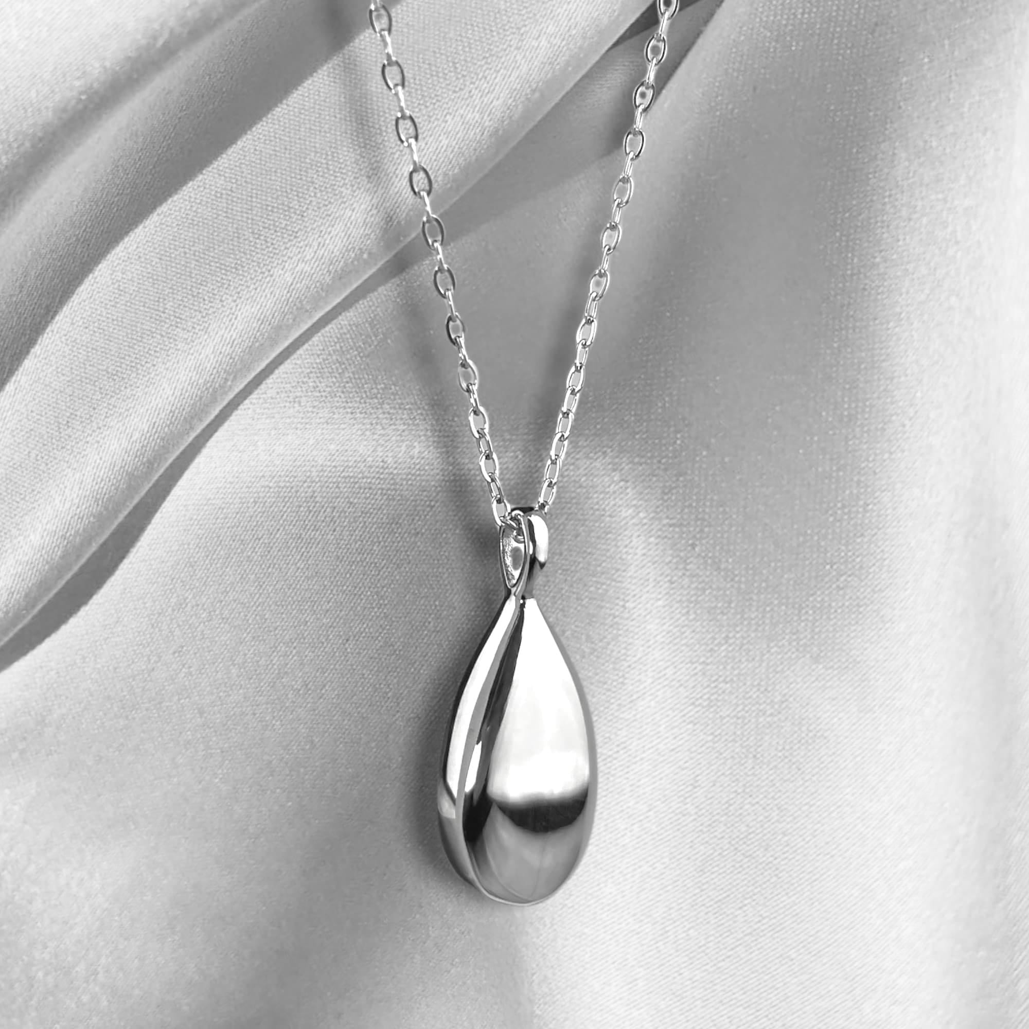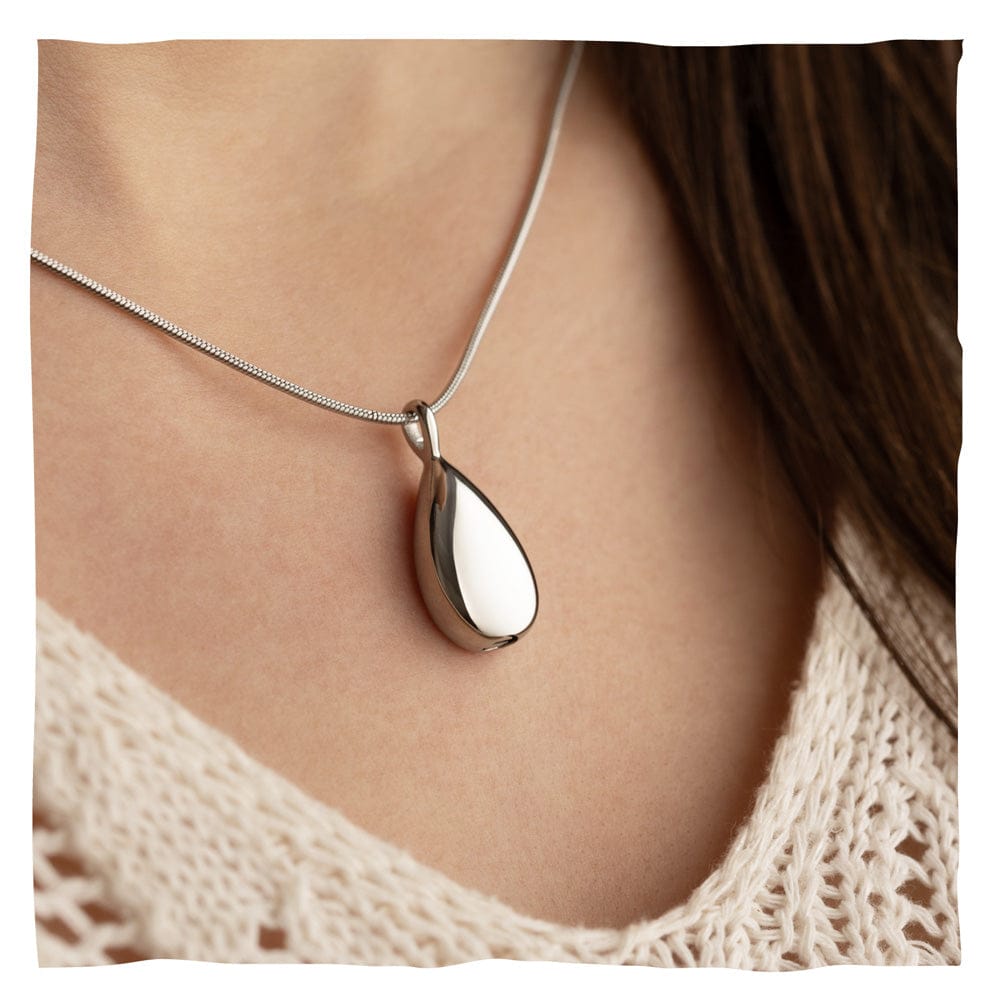 De zilverkleurige ashanger in druppel vorm heeft een elegante en vloeiende uitstraling. De hanger lijkt op een traan of waterdruppel, wat symbool staat voor zowel verdriet als liefde. De gladde lijnen en afgeronde vorm geven het sieraad een zachte en rustige uitstraling. Dankzij de zilverkleurige afwerking straalt de hanger tijdloze elegantie uit en past hij bij vrijwel elke outfit.