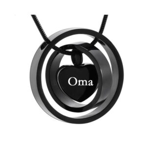 Het zwart assieraad hart in ringen oma is een bijzonder en stijlvol gedenksieraad dat met zorg is gemaakt. Dit sieraad heeft de vorm van een hart, uitgevoerd in een diepe zwarte kleur.