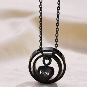 Het zwart assieraad hart in ringen papa is een bijzonder gedenksieraad dat liefde, verbondenheid en herinnering samenbrengt. Dit sieraad is ontworpen in de vorm van een hart, hét universele symbool van liefde en warmte. Rondom het hart zijn elegante ringen aangebracht, die zorgen voor diepte en een verfijnde uitstraling. Deze ringen staan symbool voor oneindigheid en een band die nooit zal verdwijnen. De inscriptie papa maakt dit assieraad extra persoonlijk en speciaal. Het is een eerbetoon aan een vader die altijd een belangrijke plaats in uw leven heeft gehad.