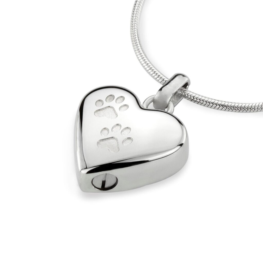 Met dit prachtige assieraad in hartvorm met hondenpootjes bewaart u de herinnering aan uw geliefde huisdier op een stijlvolle manier. Dankzij het moderne zilverkleurige ontwerp en de mooie glans is deze dieren ashanger een van onze populairste assieraden. Het sierad is zeer geliefd bij dierenliefhebbers die hun dierbare vriend dichtbij willen houden.