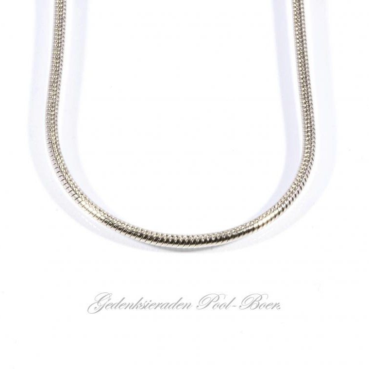 Met de edelstalen RVS ketting (slang-model) van Uitvaartland kiest u voor klasse en stijl. Deze ketting heeft een elegante glans en is zeer stevig. Zo draagt u uw assieraad altijd met een gerust gevoel. De sterke schakels geven extra bescherming tegen verlies.