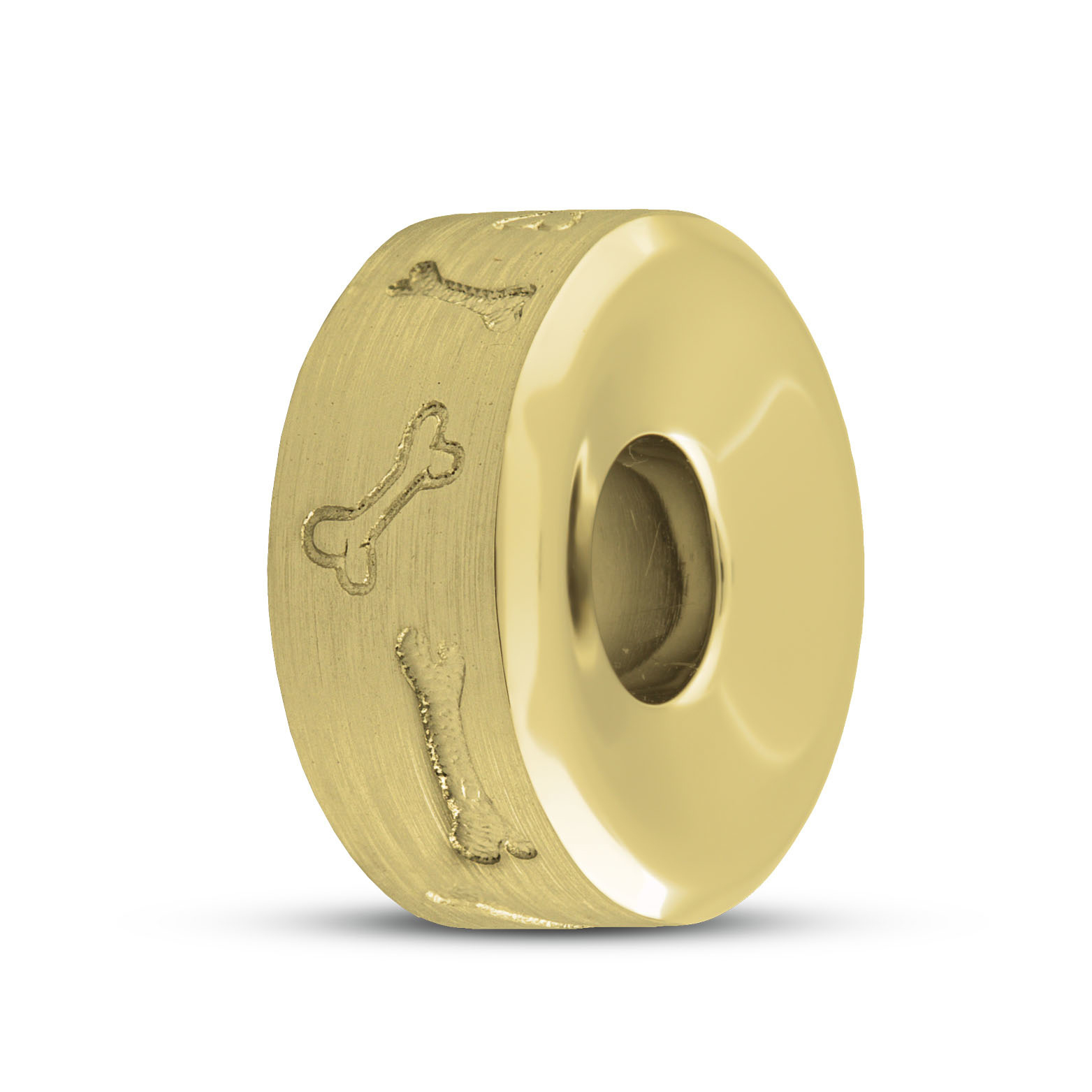 De bedel heeft een ronde basis van goud, met daarop een duidelijk zichtbaar hondenbotje in reliëf. Dit botje vormt het hart van het ontwerp en staat symbool voor de trouw en speelsheid van je hond. De lijnen zijn zacht en vloeiend, zonder scherpe randen. Het goud is glad gepolijst, wat zorgt voor een glanzende en elegante afwerking. Dankzij dit vakmanschap oogt het bedeltje zowel stijlvol als liefdevol eenvoudig.