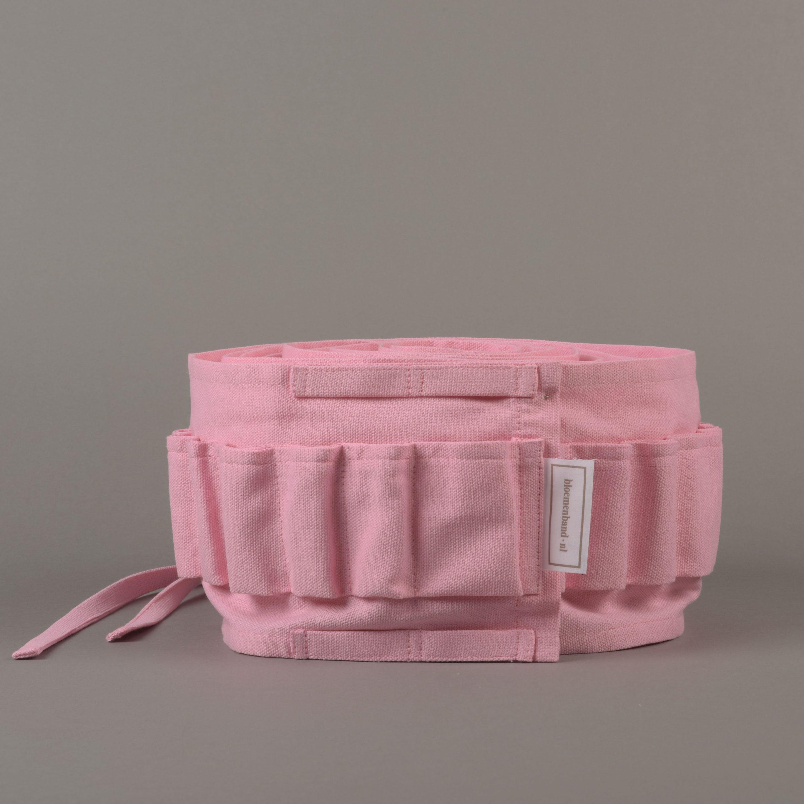 Deze prachtige roze bloemenband is een stoffen band die om een (open of gesloten) uitvaartkist of uitvaartmand wordt gestrikt bij een crematie, begrafenis of natuurbegrafenis. De bloemenband bestaat uit 170 lusjes waarin losse bloemen passen die iedereen er zelf in kan steken.