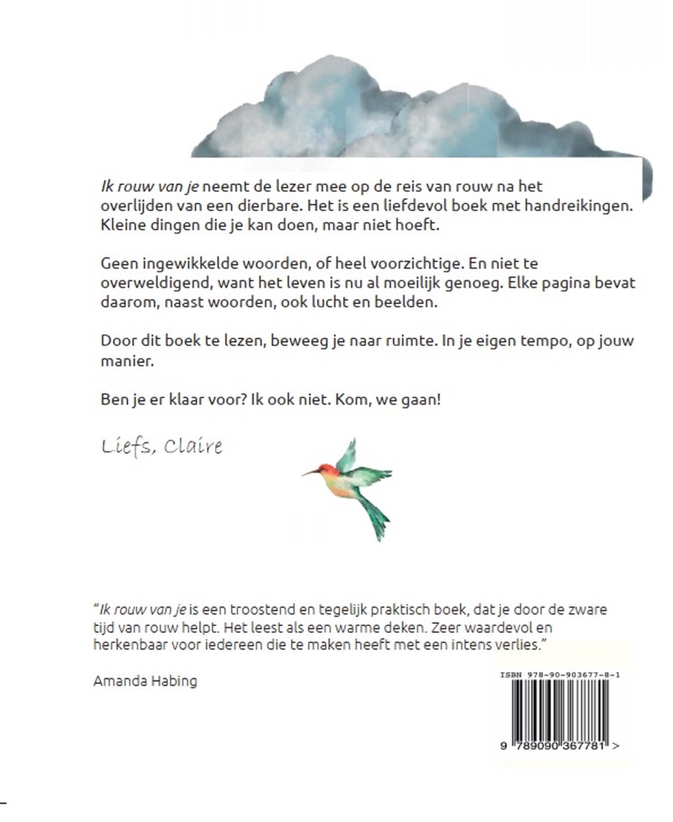 De titel Ik rouw van je zegt alles. Rouw is niet alleen verdriet om iemand die er niet meer is, maar ook een uitdrukking van liefde. Dit boek laat zien dat rouw niet verdwijnt, maar langzaam verandert in een manier van dichtbij zijn. De zachte kleur van de omslag en het ingetogen ontwerp symboliseren rust, reflectie en acceptatie.