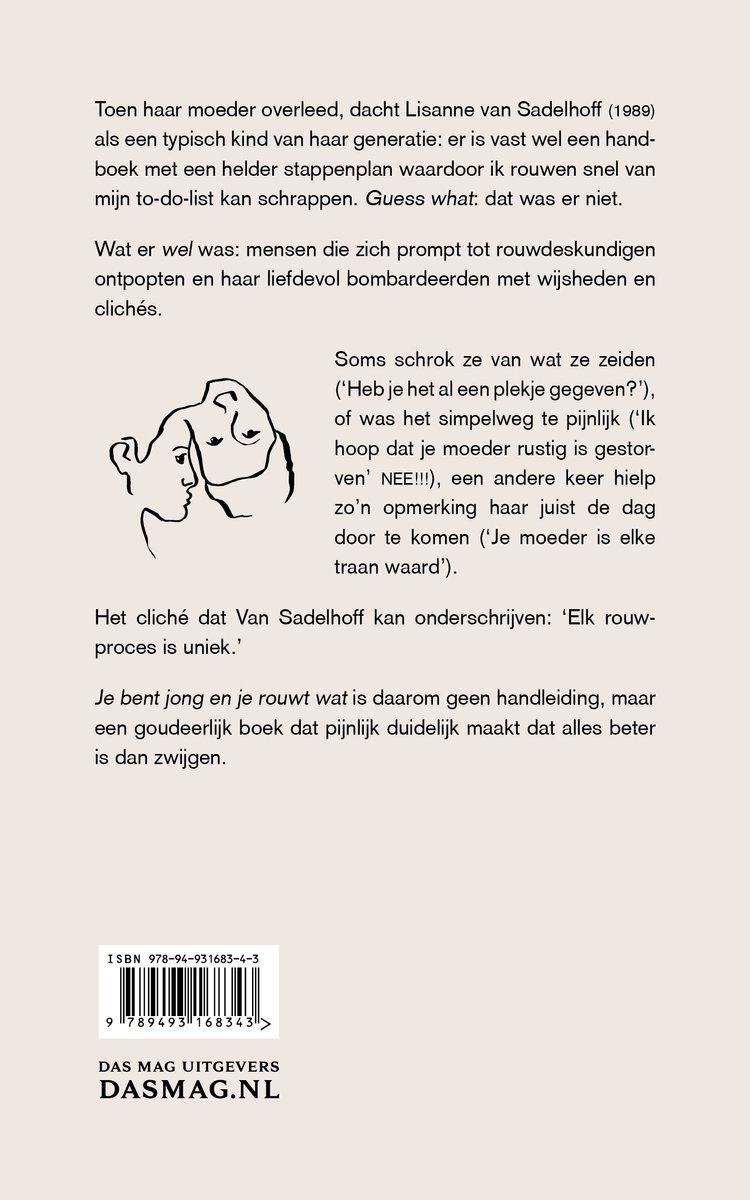 De vormgeving van Je bent jong en je rouwt, wat dan? is zorgvuldig gekozen. De stevige, matte kaft geeft het boek een duurzame uitstraling — het voelt prettig in de hand, alsof het je uitnodigt om het vaak vast te houden. De rustige kleuren en zachte lijnen van de omslag passen bij het thema: troost, tijd en groei. Binnenin zijn de pagina’s overzichtelijk en goed leesbaar. Korte tekstblokken, rustige marges en fijne lettergrootte zorgen ervoor dat lezen niet overweldigend voelt.