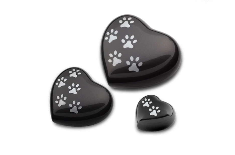 De urn heeft een moderne, zachte antracietkleur met een matte afwerking. De ronde vormen en vloeiende lijnen geven het hart een warme, rustgevende uitstraling. De pootjes aan de bovenkant zijn licht glanzend afgewerkt, waardoor ze op een mooie manier contrasteren met de matte achtergrond. Deze combinatie van materialen en kleuren maakt de urn tijdloos en geschikt voor elk interieur.