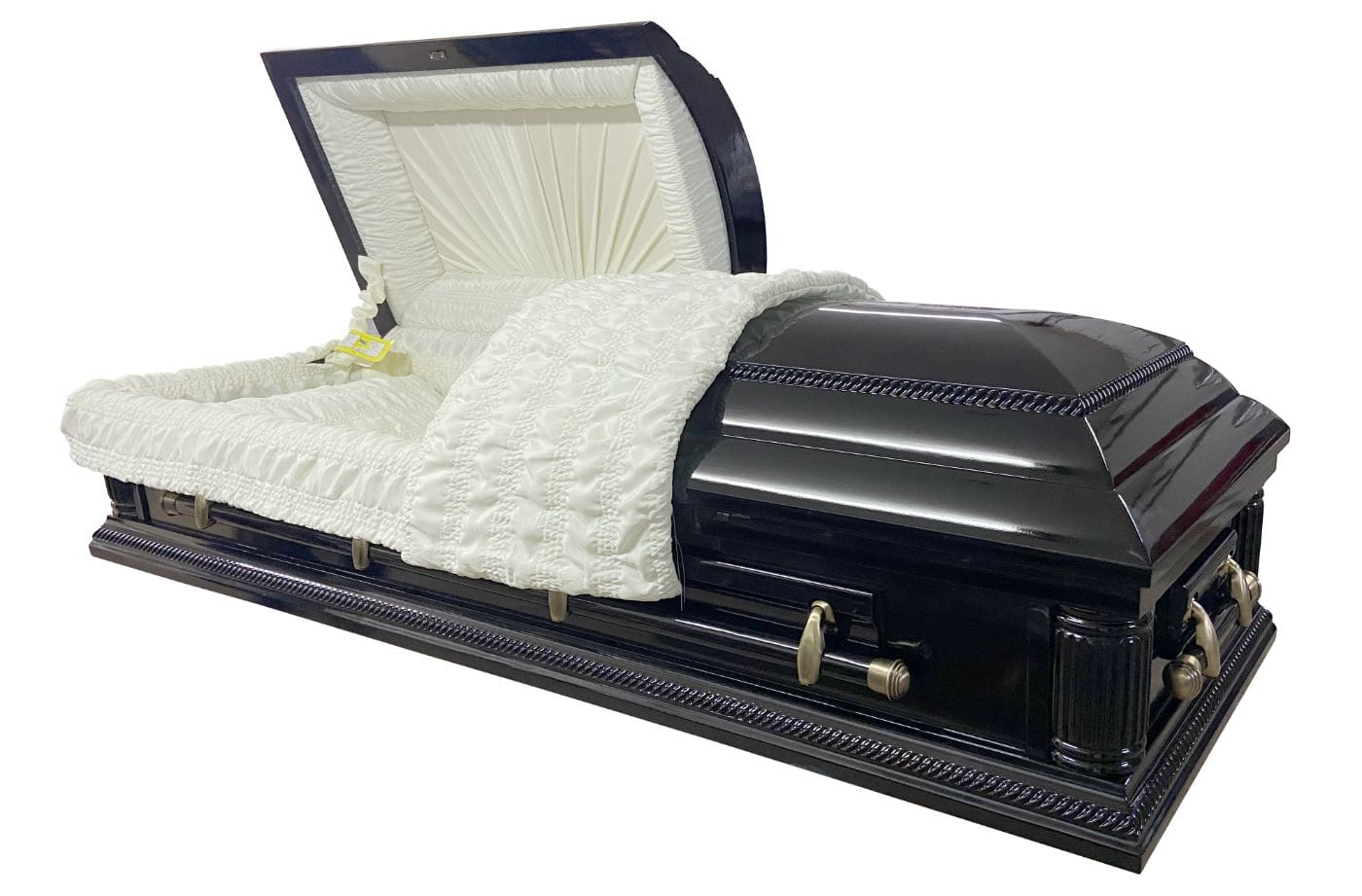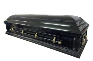 Deze zwarte Amerikaanse grafkist heeft een klassieke en luxe uitstraling. De kist is gespoten in hoogglans zwart.