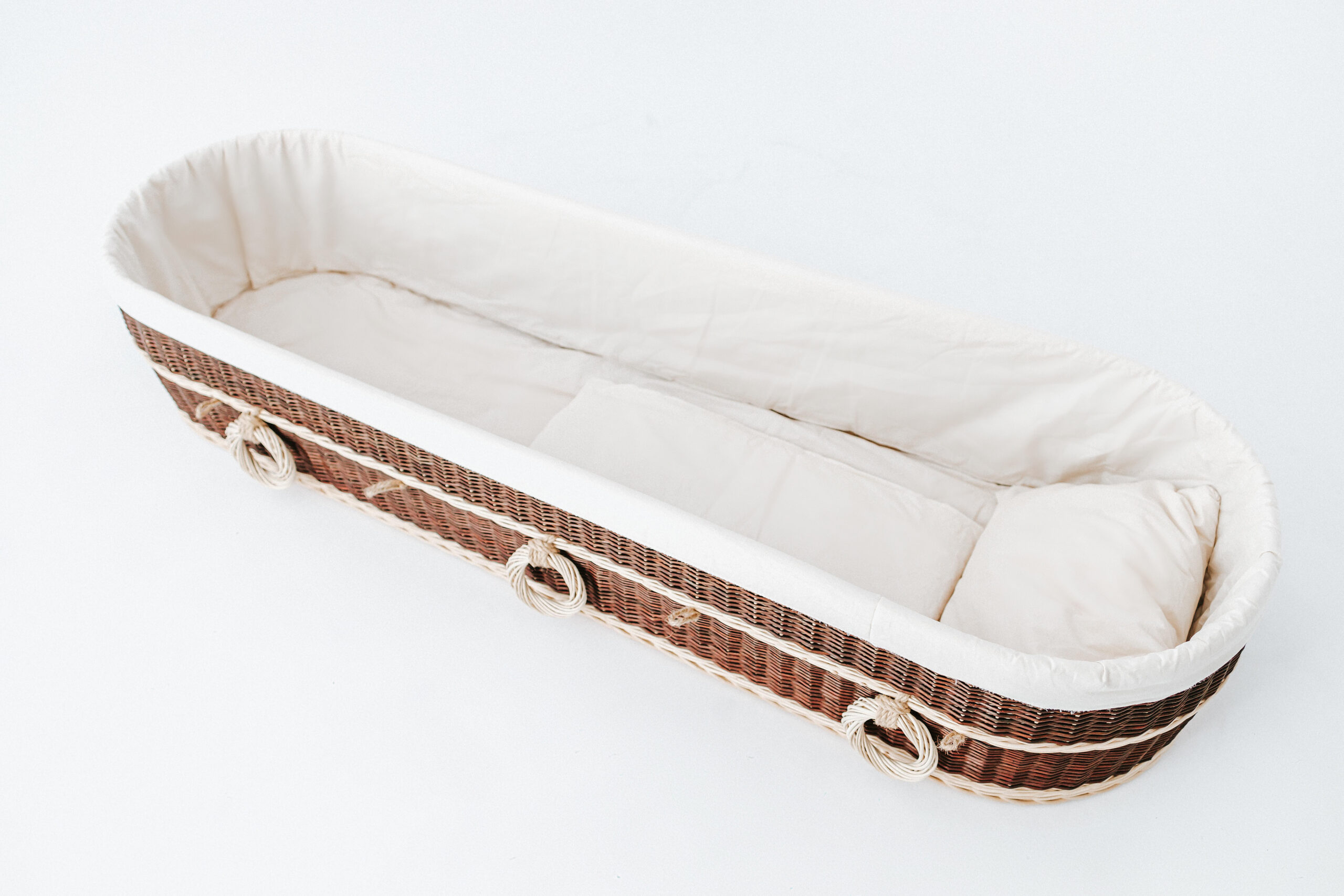 De Rieten uitvaartmand sereen symboliseert rust, eenvoud en de natuurlijke terugkeer naar de aarde.