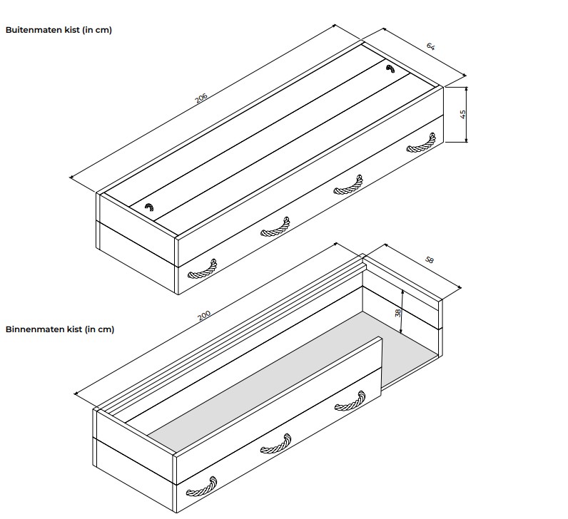 200 cm lang x 58 cm breed x 38 cm hoog