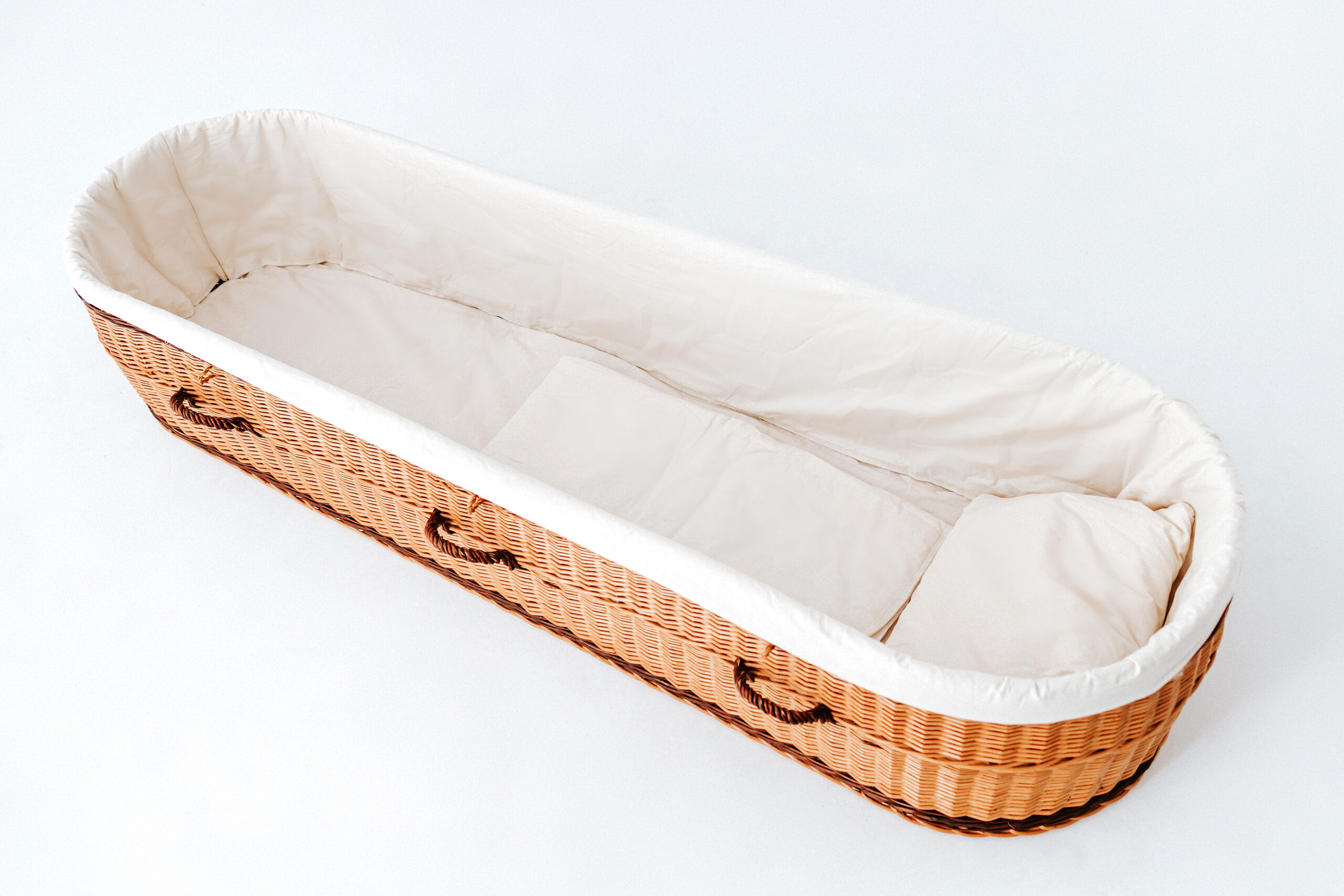 De binnenvoering biedt een nette en respectvolle plek voor de overledene. Het natuurlijke materiaal maakt de mand geschikt voor een milieuvriendelijke crematie of begrafenis. De eenvoud en zachtheid passen bij zowel traditionele als moderne afscheidsstijlen.