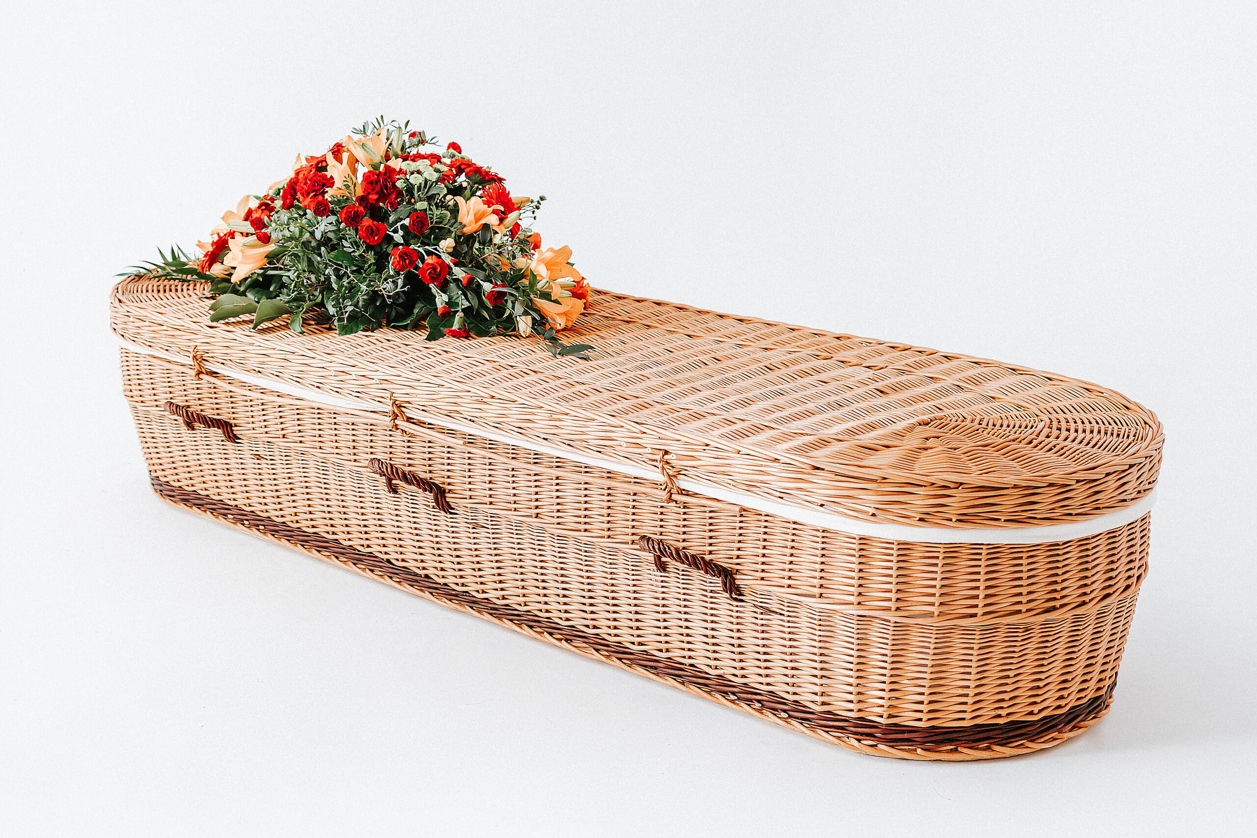 De binnenzijde is bekleed met zachte, ongebleekte katoen. Deze combinatie maakt de Uitvaartmand deftig volledig biologisch afbreekbaar en milieuvriendelijk. Elk exemplaar is uniek door het ambachtelijke vlechtwerk en de natuurlijke kleurnuances.