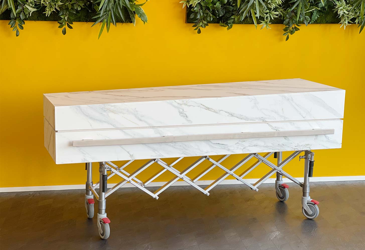 De zachte lijnen van de kist en het egale oppervlak van de wrapping symboliseren vrede en eenheid. De glanzende folie kan worden gezien als een weerspiegeling van licht — een teken van overgang, troost en eeuwigheid. Door te kiezen voor een specifieke kleur of patroon krijgt de kist een diepere betekenis.
