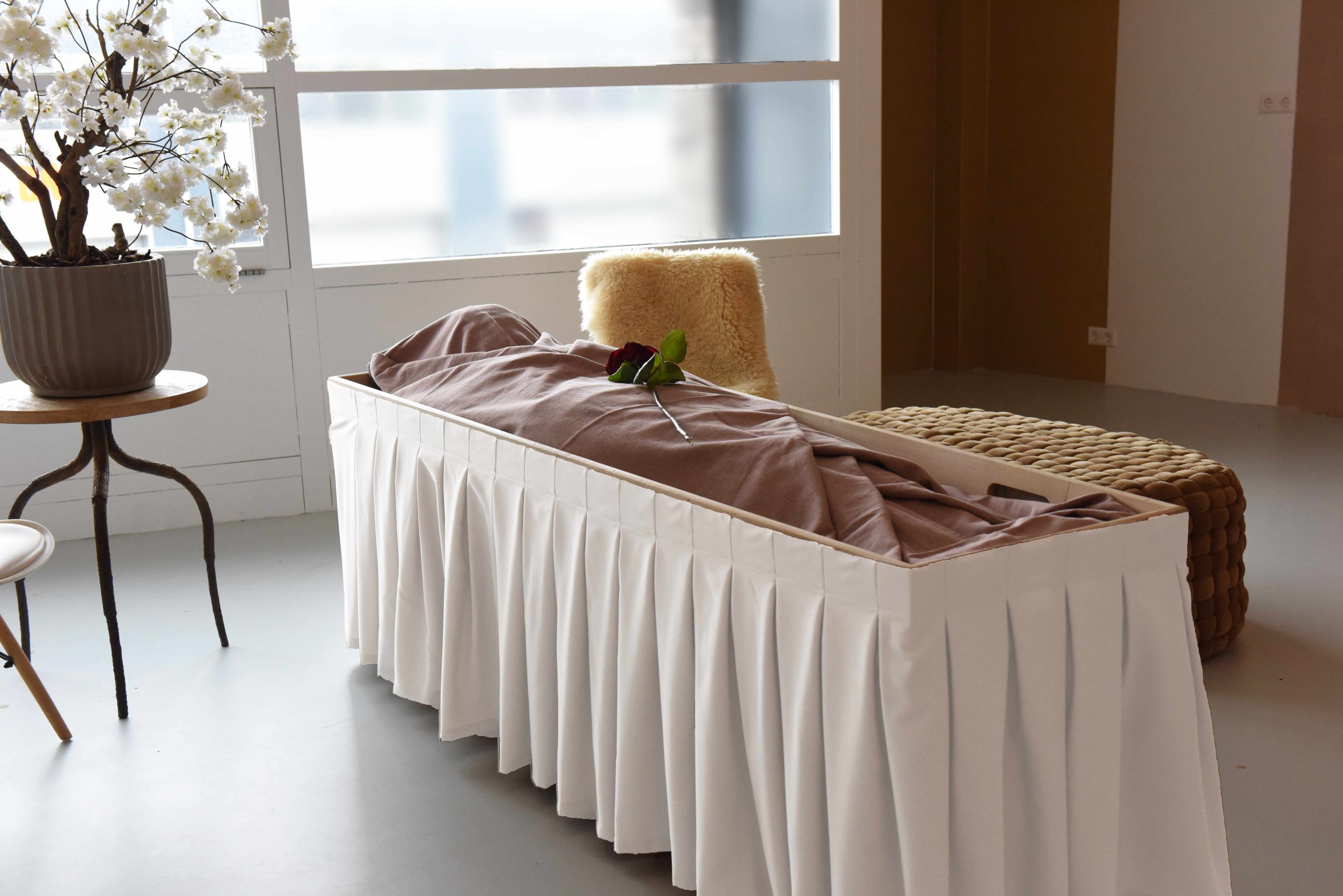 De kistrok is gemaakt van een hoogwaardige, soepele stof met een lichte glans. De afwerking is nauwkeurig uitgevoerd, met een nette zoom en fijne stiksels die bijdragen aan de kwaliteit en duurzaamheid. Door de lichte plooien valt de stof elegant langs de randen van de kist, waardoor er een gevoel van zachtheid en geborgenheid ontstaat. Het materiaal is ademend en voelt prettig aan, ideaal om een natuurlijke en serene sfeer te creëren tijdens het afscheid.