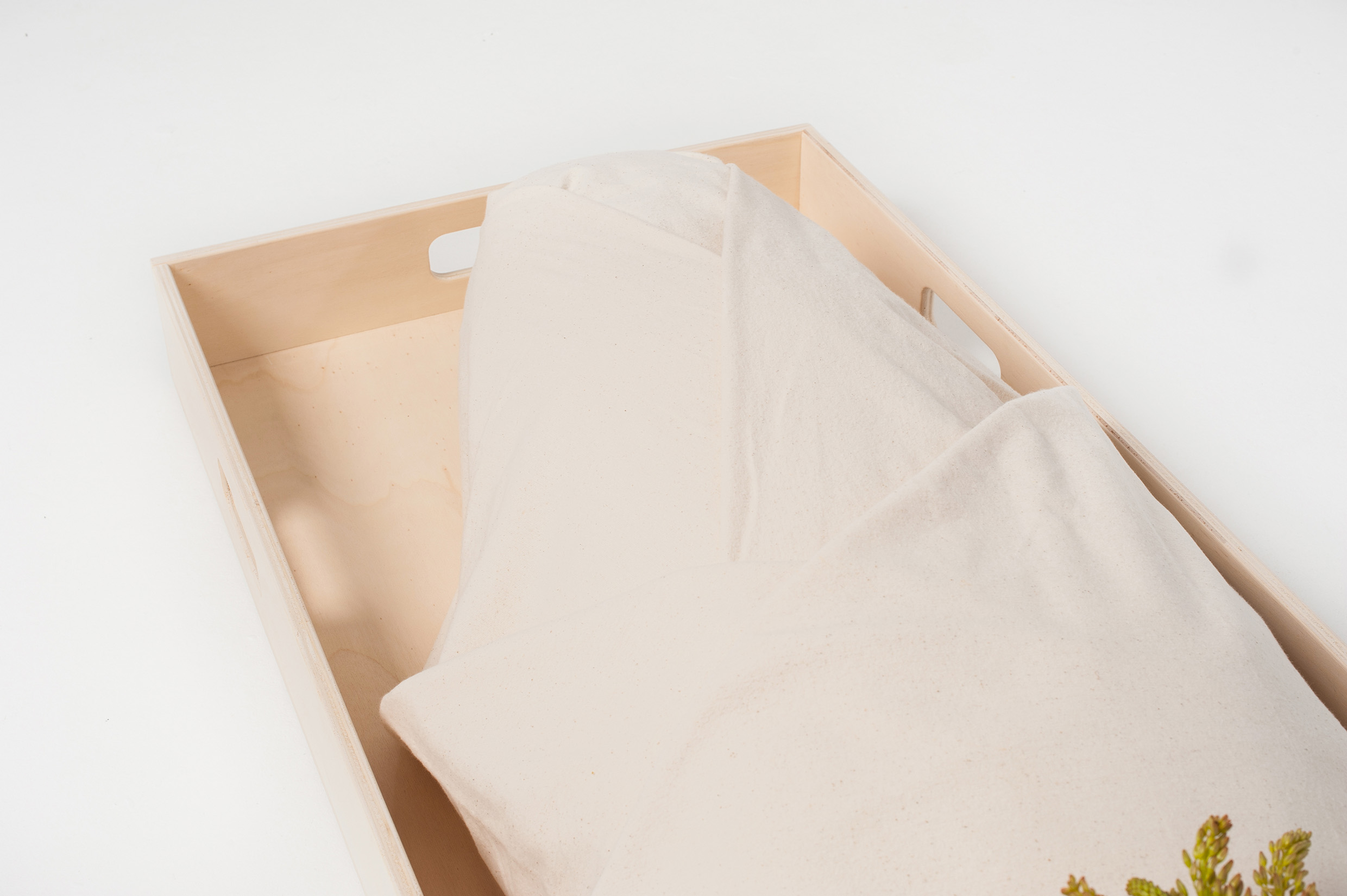 Het eenvoudige, pure ontwerp past bij mensen die houden van eerlijke materialen en een milieuvriendelijke uitvaart. Elke vezel van deze wade vertelt iets over eenvoud, zachtheid en respect voor mens en natuur.