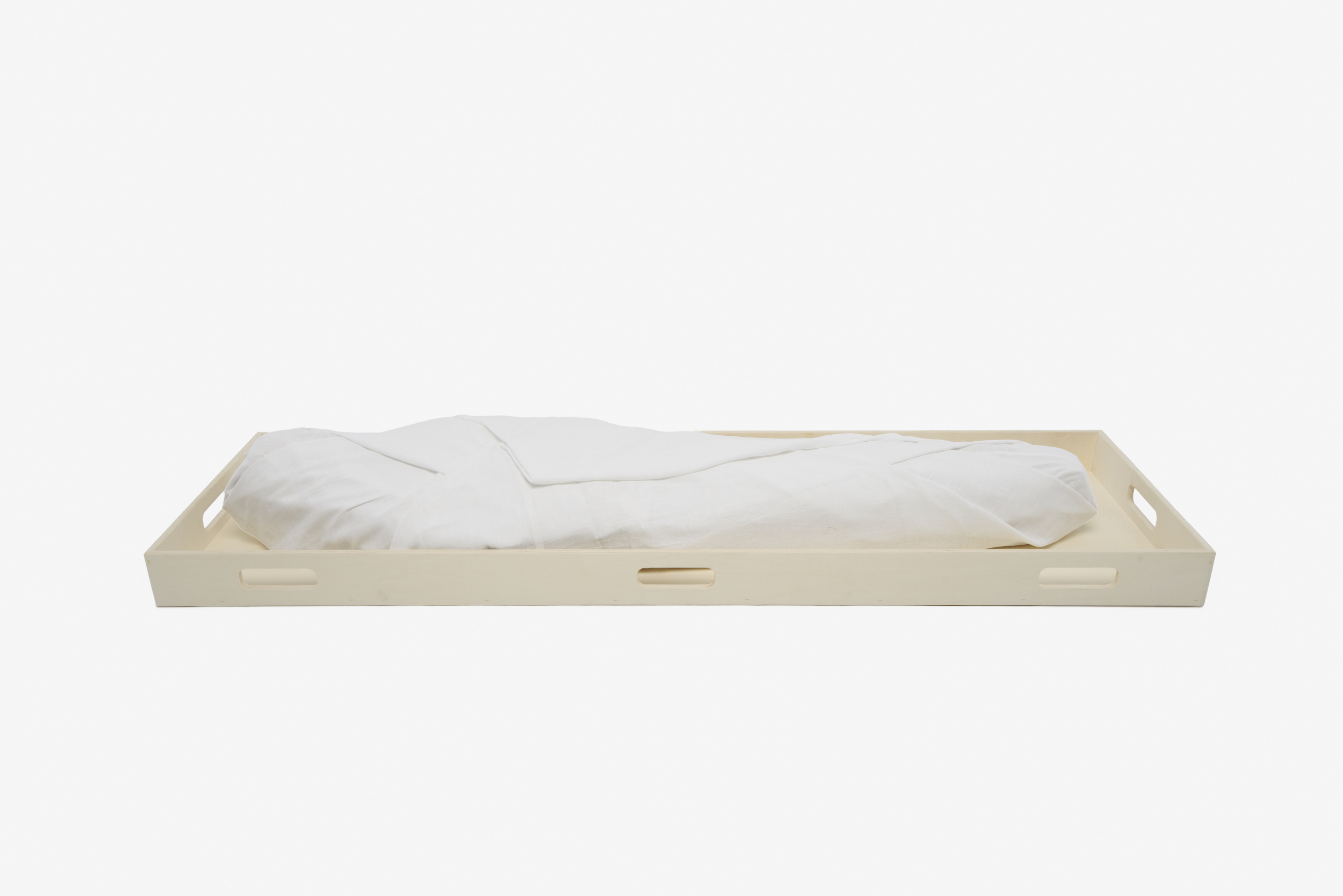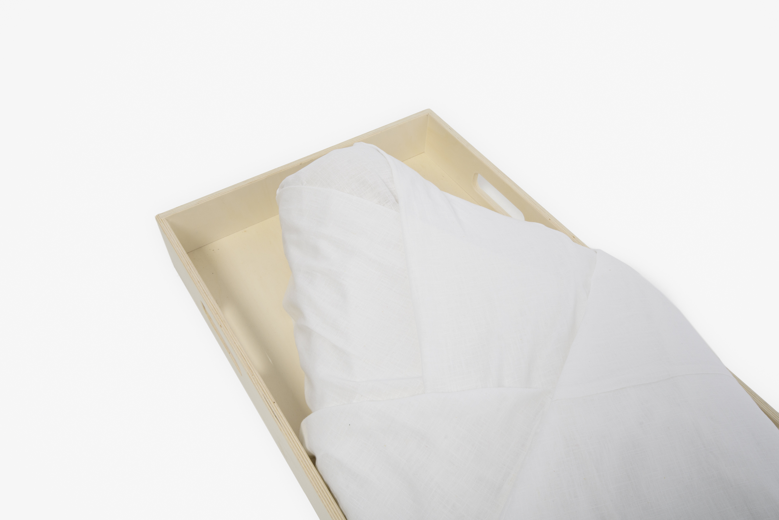 De witte lijkwade van 100% biologisch katoen straalt rust en eenvoud uit. De stof is zacht en soepel, met een subtiele glans die het licht op een natuurlijke manier vangt. De lijnen van de wade zijn rustig en vloeiend, zonder harde naden of stiksels die de sereniteit doorbreken. Het ontwerp is bewust eenvoudig gehouden, zodat de aandacht uitgaat naar het moment van afscheid.