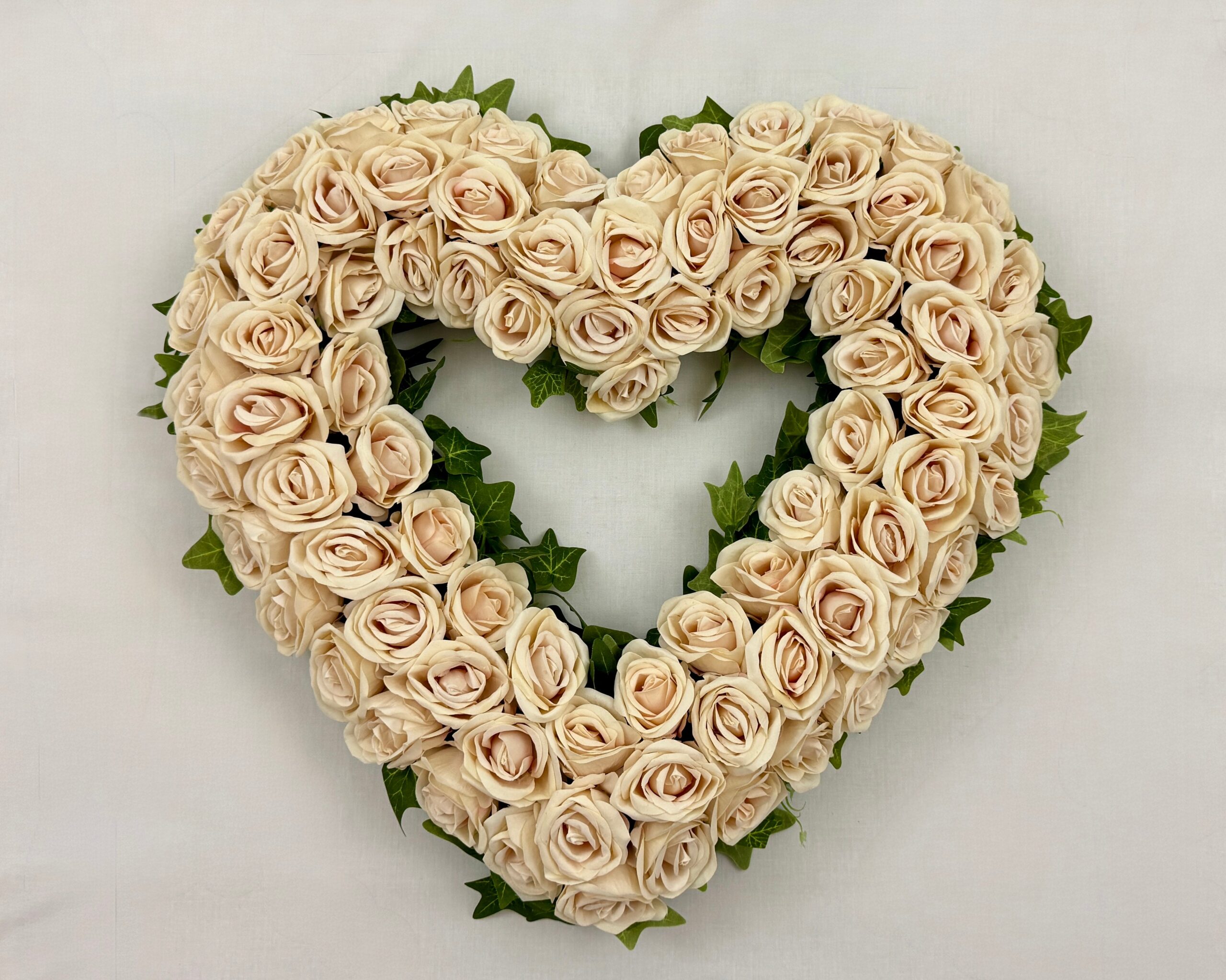 Dit hartvormige rouwstuk is een liefdevolle en betekenisvolle keuze voor een uitvaart. Het stuk verbeeldt zowel het verdriet om het afscheid als de dankbaarheid voor het leven dat gedeeld is. Dit rouwstuk is bijzonder geschikt voor iemand die met liefde werd omringd en voor altijd in het hart zal blijven voortleven.