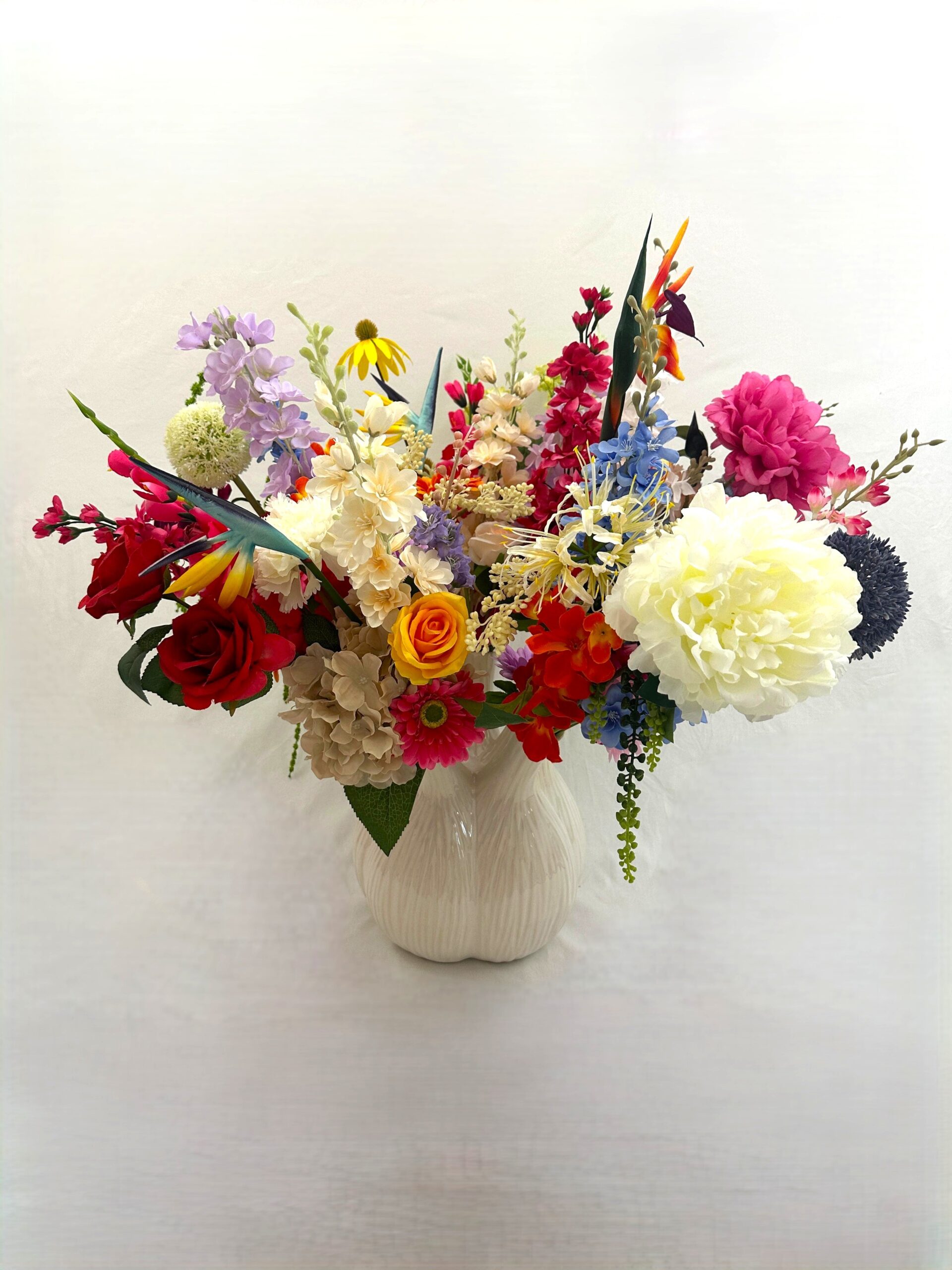 Een staande boeket is altijd goed. Het is warm, groots en zelfs na het afscheid als regulier boeket geschikt.
