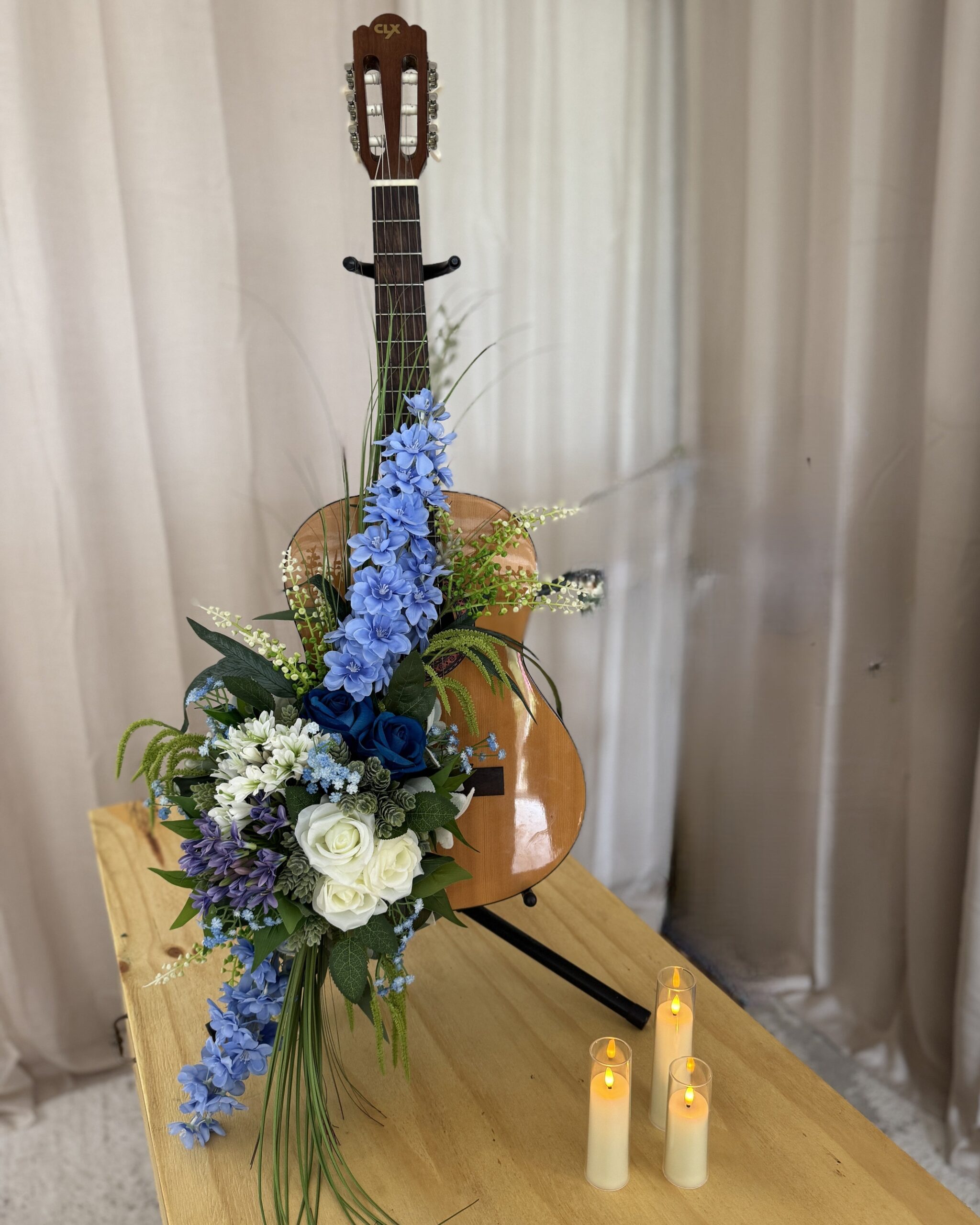 Dit rouwstuk is gemaakt voor iemand bij wie muziek een rode draad in het leven was. Iemand die zong, speelde, schreef of luisterde met hart en ziel. De gitaar als basis zegt alles. Het is een symbool van karakter. Van verhalen die verteld werden in akkoorden. Van troost en gevoel die klonken in een eenvoudig lied. De bloemen zijn zorgvuldig gekozen om die muzikale ziel te weerspiegelen.