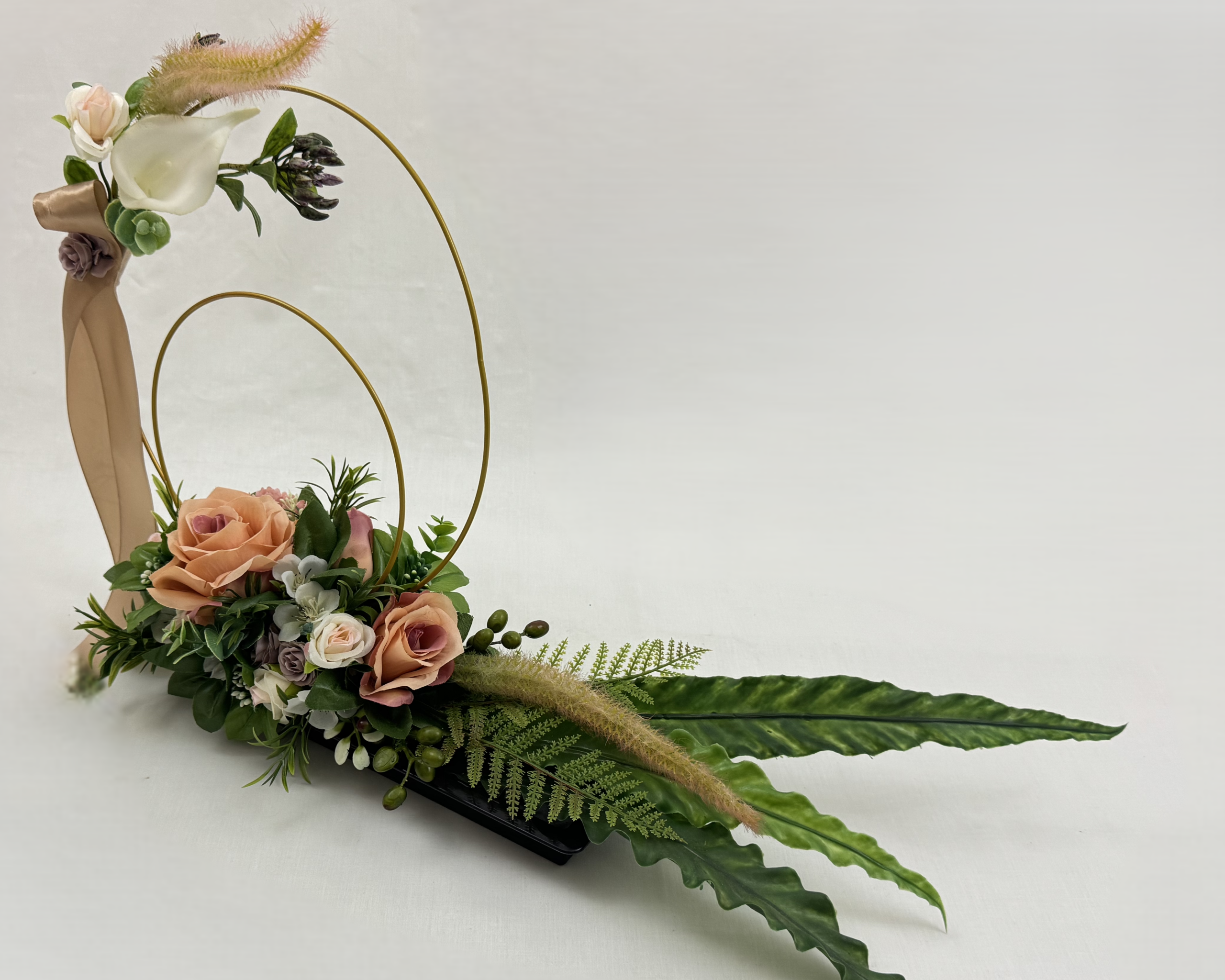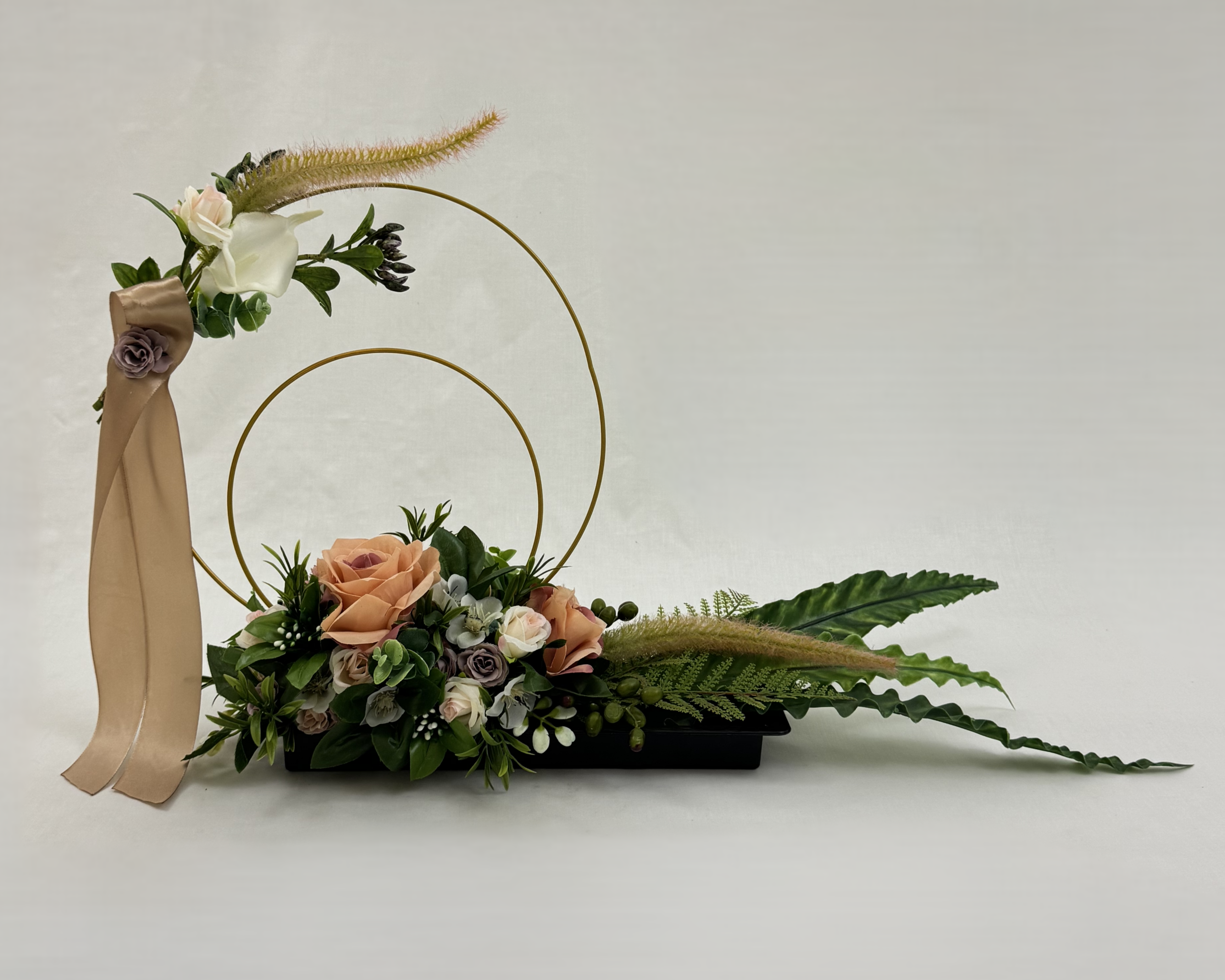 Dit stijlvolle rouwstuk is opgebouwd rond twee elegante gouden bogen die de bloemen een luchtige en moderne omlijsting geven. De zachte tinten van de bloemen zorgen voor een sereen en harmonieus geheel, dat bijzonder goed tot zijn recht komt bij een persoonlijke en ingetogen afscheidsceremonie.